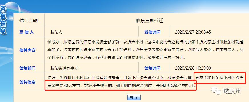 对此,办事处解释道:根据初步估算,周家庄和胶东两个村的拆迁资金需要20亿左右,数额还是很大的。如近期再增资金到位,会同时启动6个村拆迁。