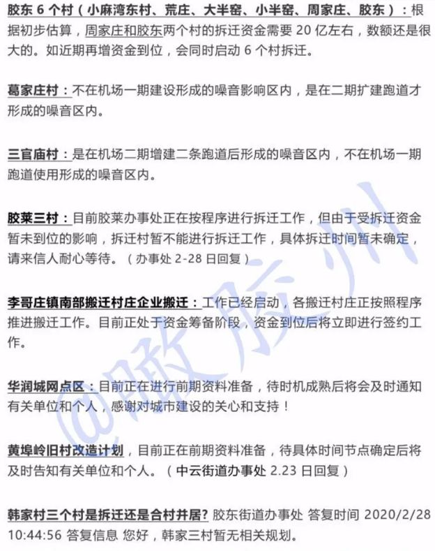 近日,有网友咨询青岛市胶州的2020年拆迁计划,根据政务网信息,汇总如下。据知情人士解释:新机场转场之前,噪音区6个村的拆迁工作都会完成,希望村民们稍安勿躁,静待佳音。
