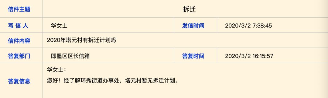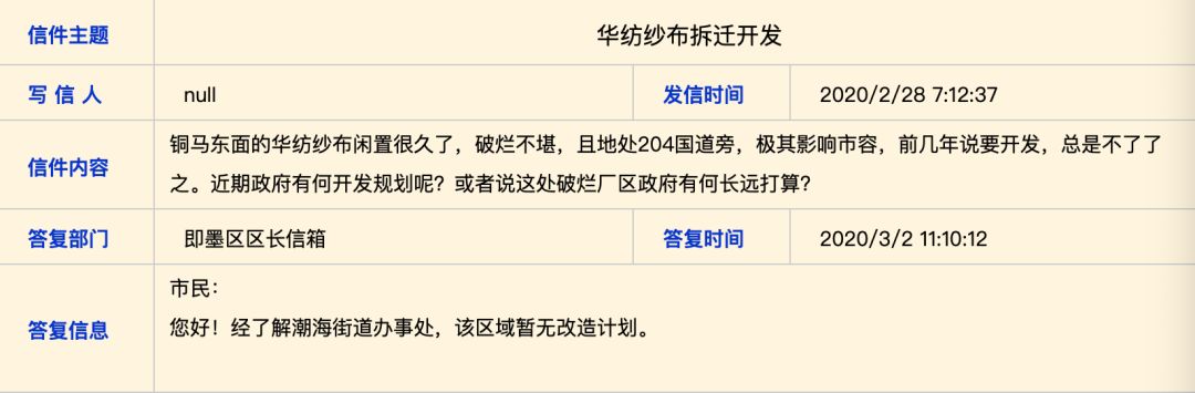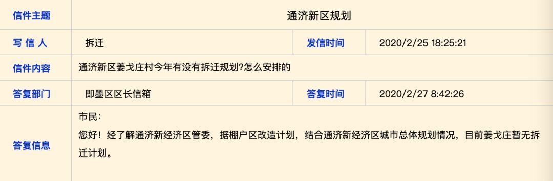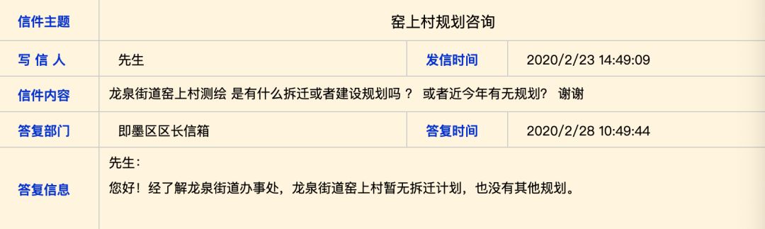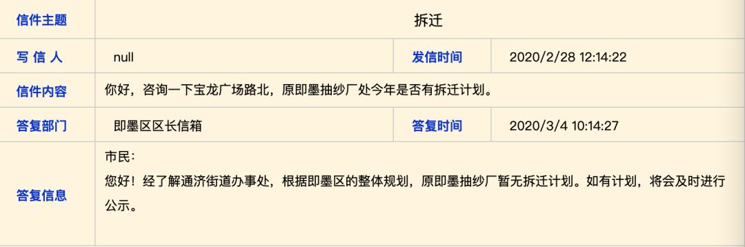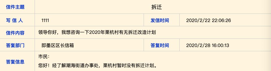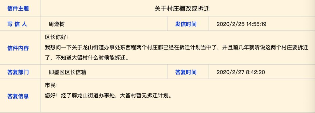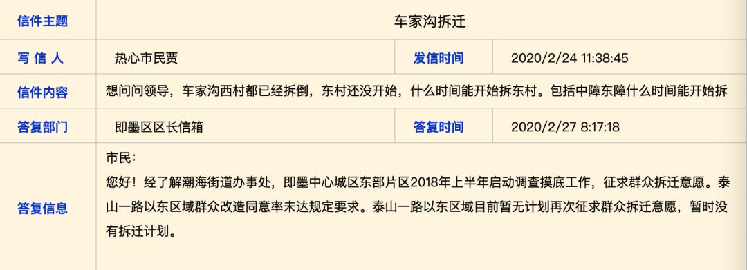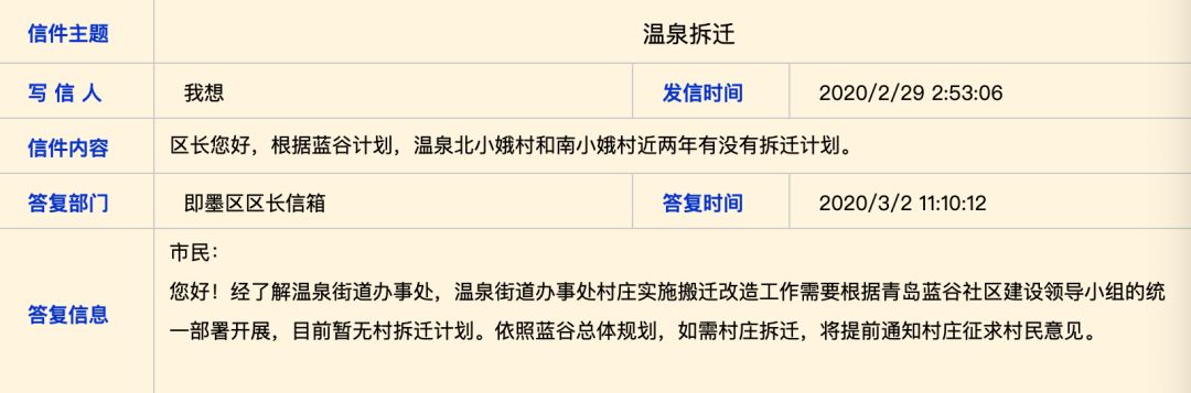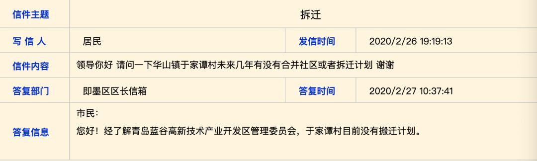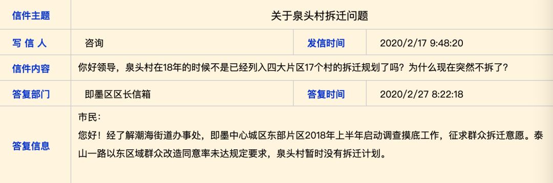 即墨区区长信箱:经协调龙泉街道办事处落实,汪汪泊村暂无拆迁计划以及其他规划。