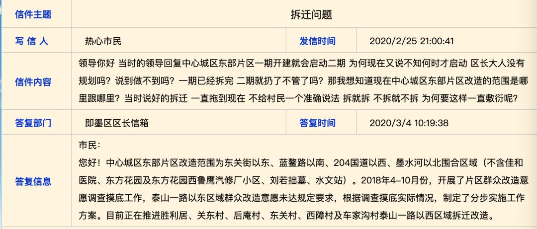 即墨区区长信箱:经协调环秀街道办事处落实,后东城村改造项目目前正在与开发商进行协商。因疫情影响,改造项目时间未定。