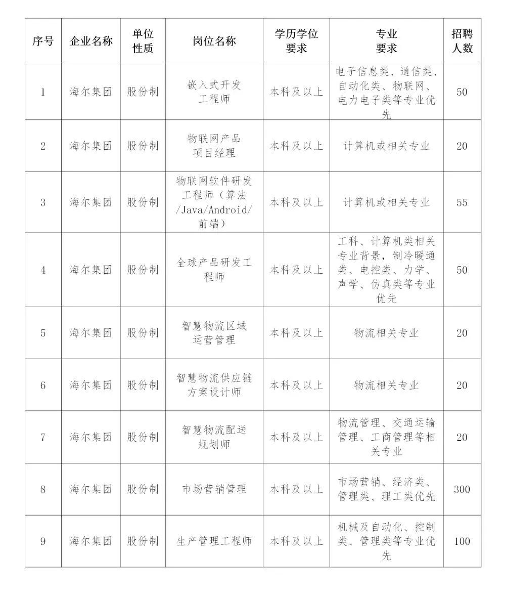 海尔集团“青鸟计划”平台岗位一览表