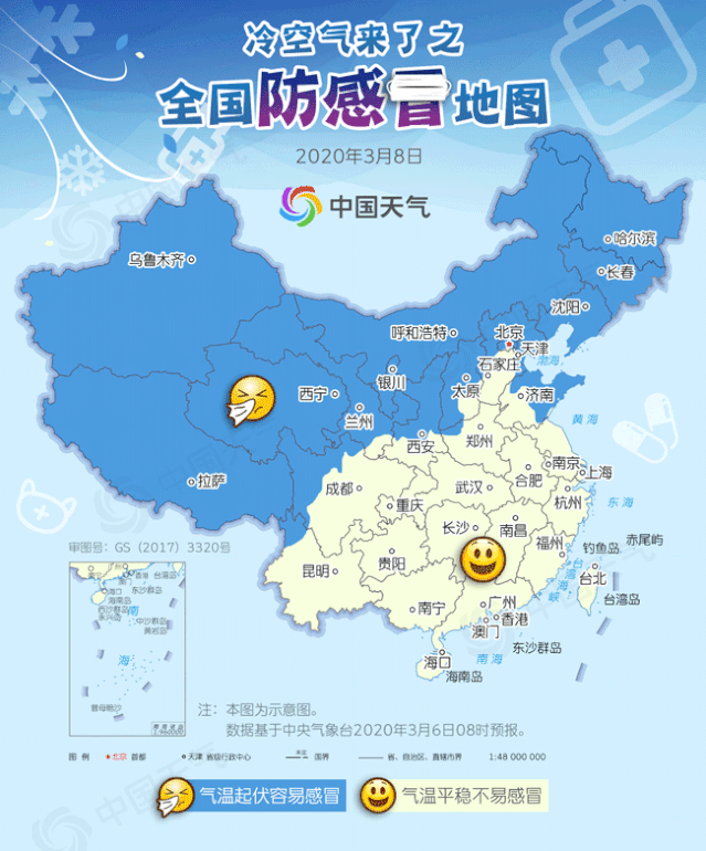 冬春交替时节,气温变化快,忽冷忽热,如果没有及时增减衣物很容易感冒。未来三天随着冷空气向南推进,我国感冒容易发生的区域也逐步扩大。