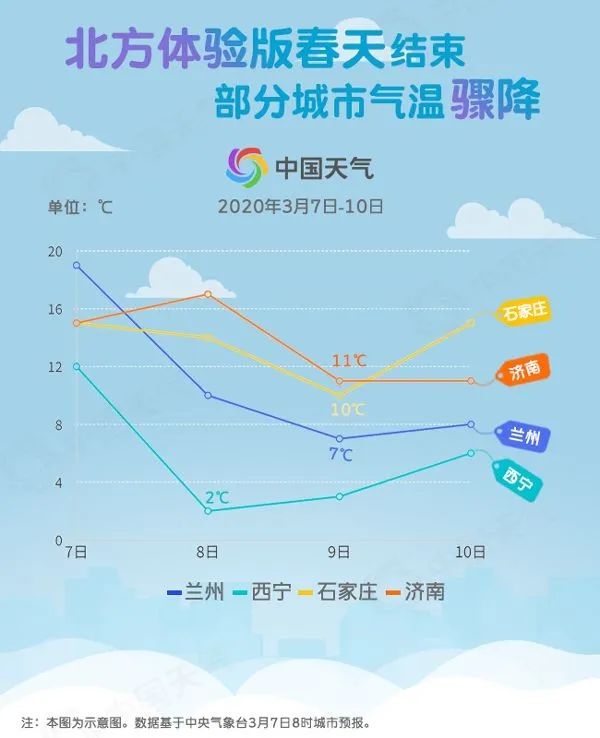 明天起冷空气带来的降温先从西北地区展开,单日降温幅度将达6-10℃,像是兰州今天最高气温19℃,明天降到10℃,到周一只有8℃;西宁今天12℃,到明天降到3℃。随后,降温推进到华北黄淮等地,降温幅度也都能达到4-8℃,像济南明天气温达到高点17℃,到周一又降到11℃。与此同时,北方雨雪又将明显增多。7日至9日,新疆北部、华北、东北地区、黄淮等地部分地区将先后出现小到中雪或雨夹雪,局地大到暴雪;江南大部、华南北部将有连阴雨天气,大部地区有中到大雨,局地暴雨,部分地区将伴有雷电等强对流天气。