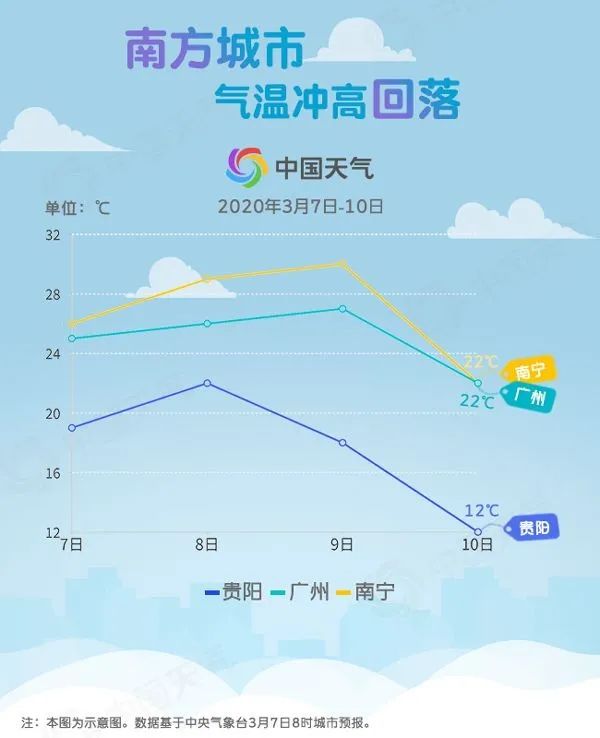 10日冷空气继续南下,西南地区东部等地降温幅度最大,像贵阳明天22℃,10日只有12℃,累计降温10℃。华南在冷空气和雨水的先后压制下,也将暂别炎热,由之前的30℃左右回落到20℃出头。