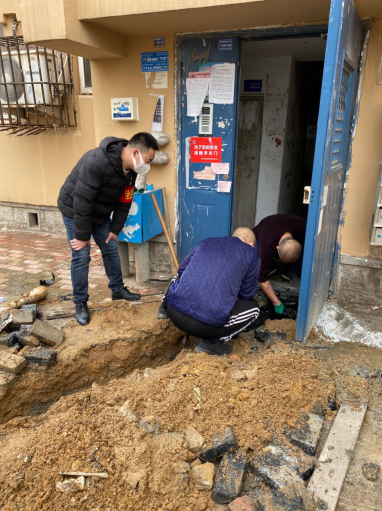 “乐安支路9号1号楼单元门口古力冒溢,社区抓紧来看看吧”。接到居民的反映电话,乐安路社区副主任孙钟相马上赶到了现场。一楼的两户房子年后一直无人居住,房主一时也联系不上,无法进门查看情况。污水从单元门口已经流的满地都是,气味难闻,居民日常出入已经受到了影响。特别是新冠肺炎疫情蔓延的特殊时期,如果不及时处理,细菌滋生更会造成居民的恐慌和不满。查看完现场的情况,孙钟相立即决定先个人垫付资金找施工队来修理,待疫情结束之后再挨家挨户找居民分摊施工的钱。受疫情的影响,下水管道维修人员基本没有返青开工,几经周折才找到了2名施工人员。孙主任与施工员一起,人工开挖地面,从楼外面沿着管道一点一点找漏点、铺管道、恢复原貌。半天的时间就解决了10余户居民的生活困扰。