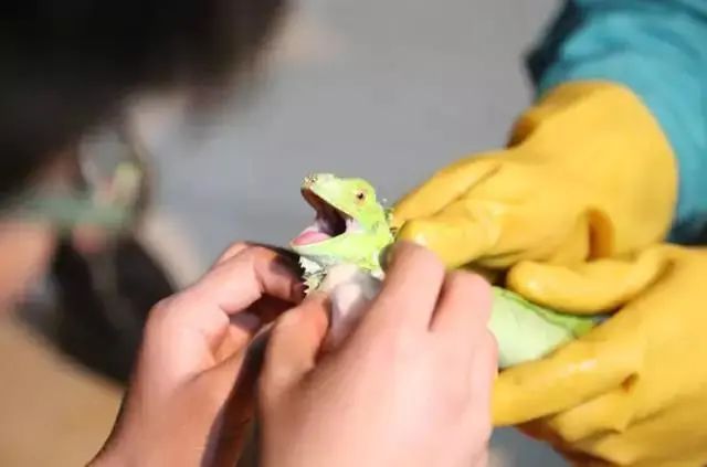 活动当日,当天河马保育员呼喊了河马“亮亮”后,听到呼喊小家伙慢慢走上岸边。随后保育员做出了“张嘴”的手势,河马“亮亮”看到手势后便张开了大嘴。兽医先检查犬齿是否有松动,接着检查咀嚼食物的牙齿是否有牙石,用特制河马漱口水清理了牙缝的食物残渣。