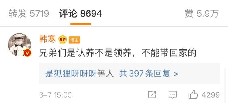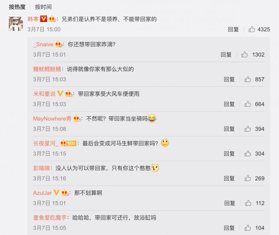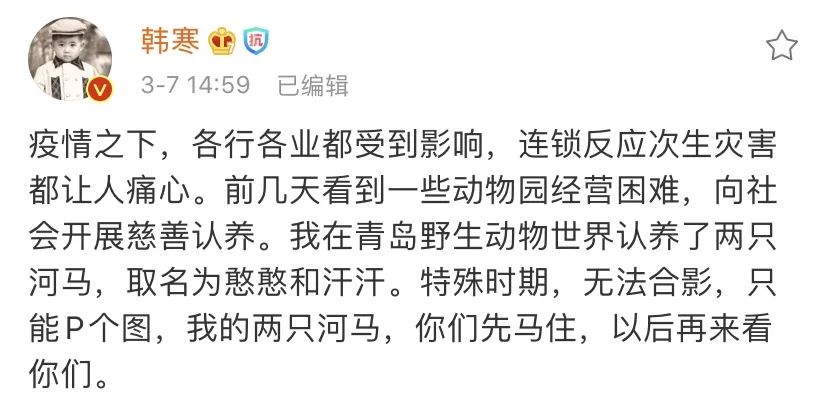 3月7日,作家韩寒更新了自己的微博,透露了自己的近况,并表示受疫情影响各种连锁反应发生,自己在几天前看到一些动物园因为没有游客,经营困难,为了保证经营,动物园向社会开展慈善认养。韩寒在看到这个消息后,很“动心”,在青岛森林野生动物世界认养了两只萌萌哒河马,一只河马先生和一只河马公主,不仅如此,韩寒还为自己认养的这两只河马取了名字,分别是憨憨和汗汗,是自己名字的谐音。更有意思的是,他还配上自己与两只河马的P图合影,发文表示“