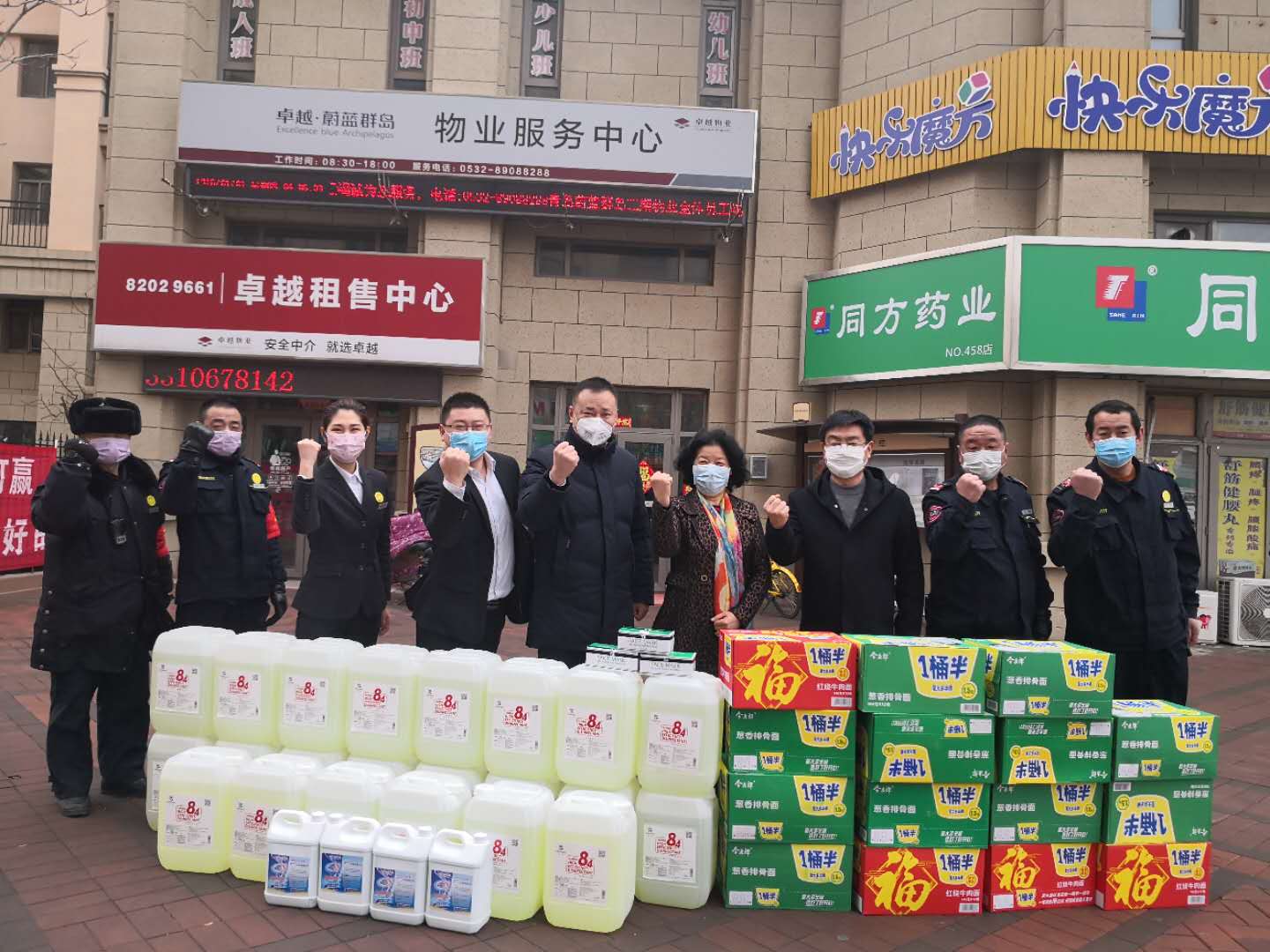 2月初,卓越蔚蓝群岛发现一名“新冠肺炎”确诊患者,一方有难,八方支援,经过商会研究决定,给会员企业卓越物业援助550公斤84消毒液、4桶乐帮消毒液、150个口罩、15箱方便面,由商会会长和党支部书记送到卓越蔚蓝群岛客服中心,做到共克时艰、守望相助。