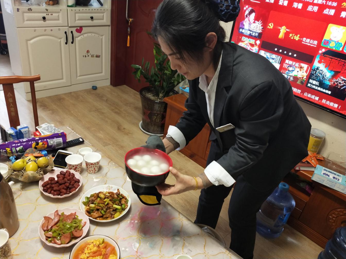吃饭是孩子最头疼的事,管家孟花莲几次在值班期间抽出时间,与安全主管王勇一起入户为孩子做饭,这一天是家人团圆的日子-元宵节,得知孩子最爱吃西红柿炒鸡蛋,管家特意到附近超市买来食材,认真清洗后为孩子烹饪。一个菜虽够孩子吃,却不够营养,所以,荤素搭配,一个小时功夫,三个菜、圆溜溜的汤圆华丽现身,乐得孩子嘻嘻直笑~管家把孩子吃饭的视频发于父母后,业主连连感谢管家的细心和贴心。