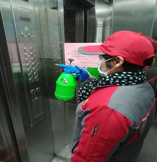 为预防、控制新型冠状病毒肺炎在社区及员工队伍中传播扩散,自疫情发生以来,环境消杀团队每日两次对小区内公共区域主干道、人行道、人车出入口、大小广场、健身器材、室外桌椅、垃圾分类点及垃圾中转站等部位进行喷洒消毒,对各单元内楼道、门厅及附属单元门、楼梯扶手等部位喷洒擦拭消毒两次,特别是单元门把手、电梯按键等高频接触部位进行重点消毒,并提供“电梯按键专用抽纸”,方便居民乘坐电梯。