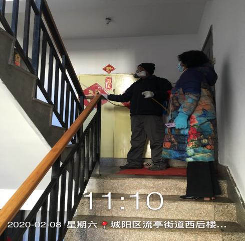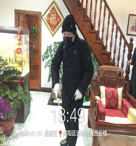 在返乡人员居家隔离解除后,党员先锋岗的党员同志自告奋勇到隔离户家中帮助其进行室内全面消毒。