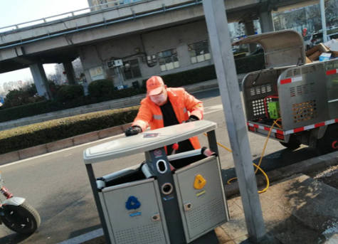 “36.7℃,36.3℃,体温正常,可以上岗。”张超和他的同事通过上岗前的体温检测后,就开始了下午的工作,根据公司要求,每天至少要进行2次体温检测,上岗工作前必须要接受体温检测,张超负责的工作是在环卫作业车辆收运完垃圾后,对垃圾桶点周边和垃圾桶进行全面彻底消杀。