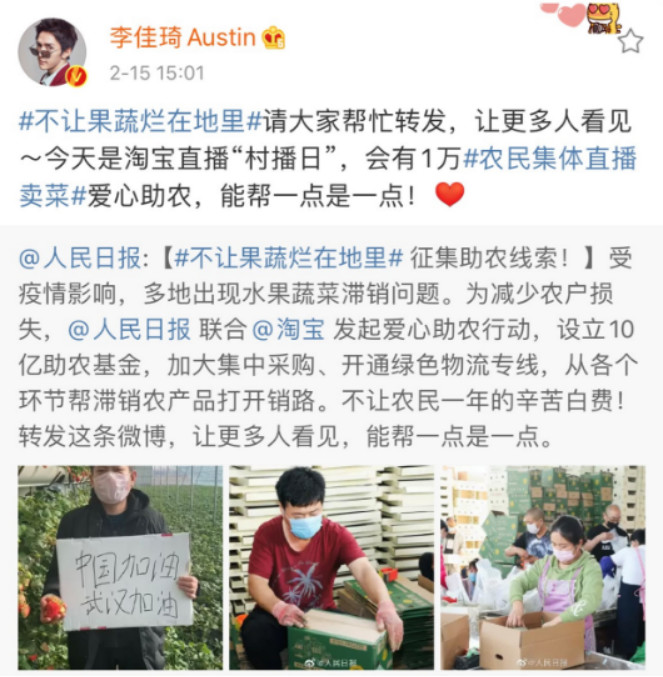 阿里巴巴旗下的天猫、淘宝、聚划算、盒马、饿了么、菜鸟……联合发起“爱心助农”计划,开足马力卖菜。