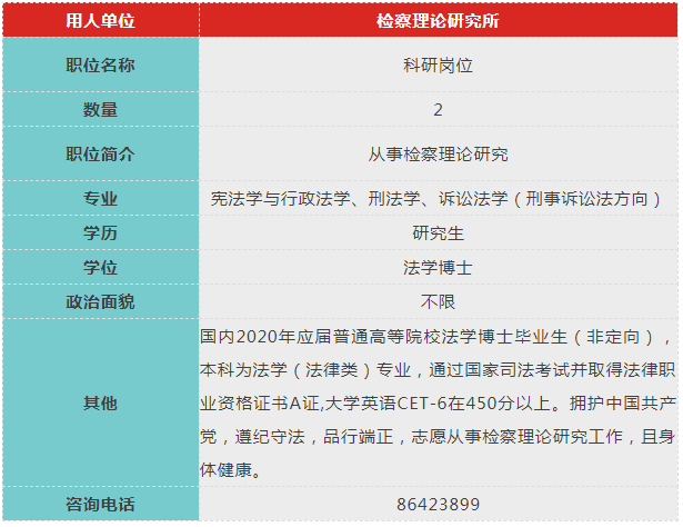 检察理论研究所2020年公开招聘工作人员2名,科研(专业技术)岗位,正式事业编制。招聘对象为国内普通高校2020年应届毕业生(委培、定向生、部队院校除外)。