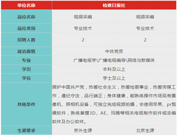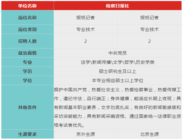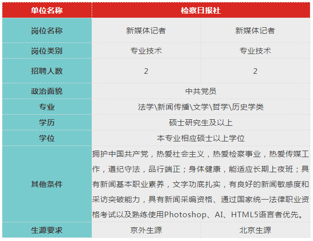 详见《2020年度最高检直属事业单位公开招聘工作人员计划表》
