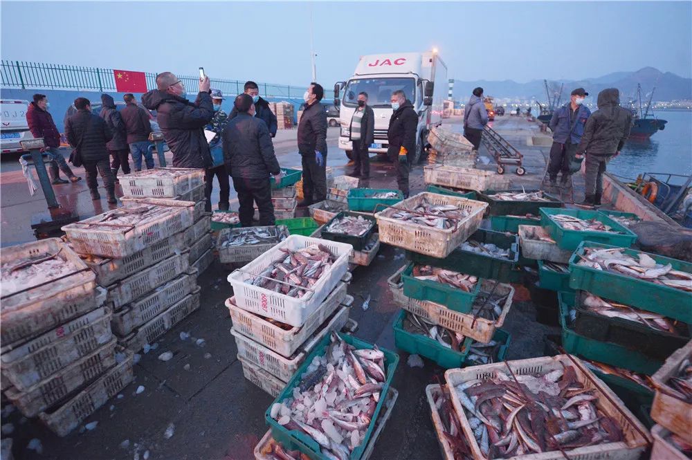 而此时,岸上的水产批发商也已经早早做好准备,收购今年复工后的第一网渔获。“我们主要是在青岛近海捕捞,目前近海海域水温仍然较低。一共有两三千斤货,主要是八带和蛎虾为主,还有一点点鱼,跟往年相比稍微少一点。”船主段孝承说。刚上岸的本地海鲜比较新鲜,八带批发价每斤25元的价格,这些海鲜不到一个小时就被好几家水产批发商抢购一空。
