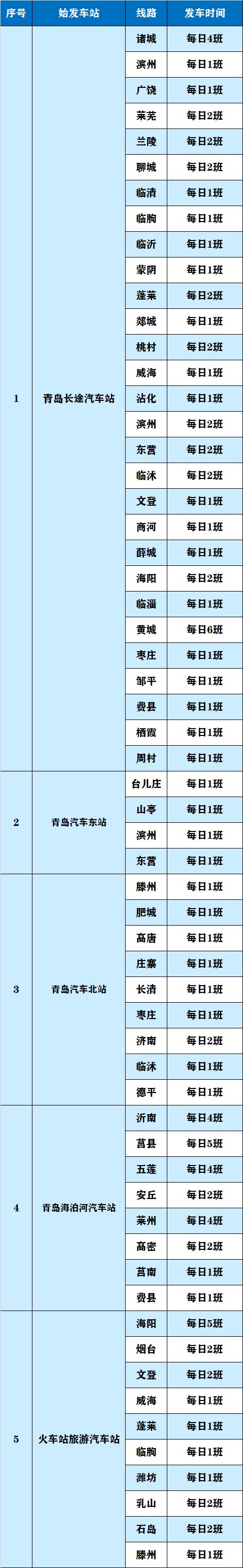 近期恢复的市际班线和县际班线以青岛长途汽车站、青岛汽车北站、青岛汽车东站、青岛沧口汽车站、青岛海泊河汽车站、青岛火车站旅游汽车站的始发班线为主,涉及栖霞、聊城、海阳、周村、莒南、费县、东营、黄城、莱州、海阳等55条线路,187个班次。