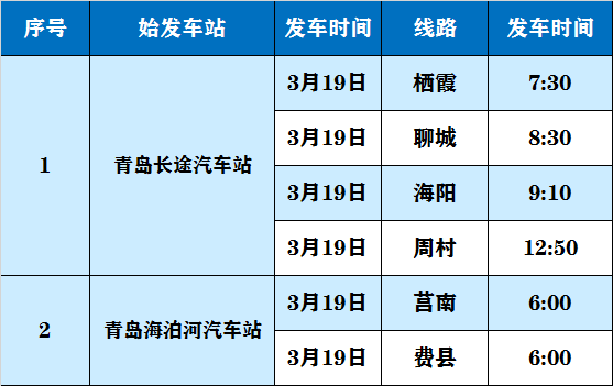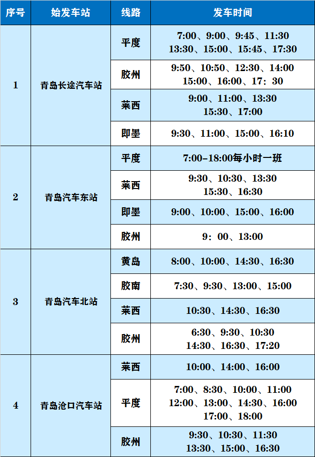 近期,青岛汽车总站所属各汽车站全面恢复市际班线和县际班线运行,班线逐步覆盖省内各地市,近期班次变化较大,旅客出行请及时关注“交运行”APP、“青岛汽车总站”官方微信公众号或拨打交运客服热线96650了解最新班次信息。