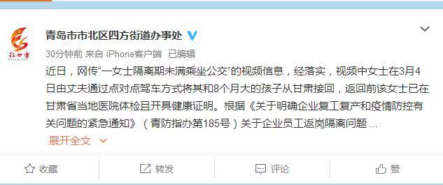 近日,网传“一女士隔离期未满乘坐公交”的视频信息,经落实,视频中女士在3月4日由丈夫通过点对点驾车方式将其和8个月大的孩子从甘肃接回,返回前该女士已在甘肃省当地医院体检且开具健康证明。根据《关于明确企业复工复产和疫情防控有关问题的紧急通知》(青防指办第185号)关于企业员工返岗隔离问题,通过“点对点”包车方式返程的工人,行前14天内在途中没有相关症状的,要尽快复工。街道考虑疫情防控需要,要求其居家隔离14天。由于该女士目前在哺乳期,因乳腺发炎疼痛难忍,于3月17日9时51分未向社区报告私自乘坐公交车到海慈医院就诊。街道根据群众反映的情况已约谈该女士及其丈夫,对其进行批评教育。下一步,街道将进一步加大对隔离人员的管控力度,防止此类事件的发生。