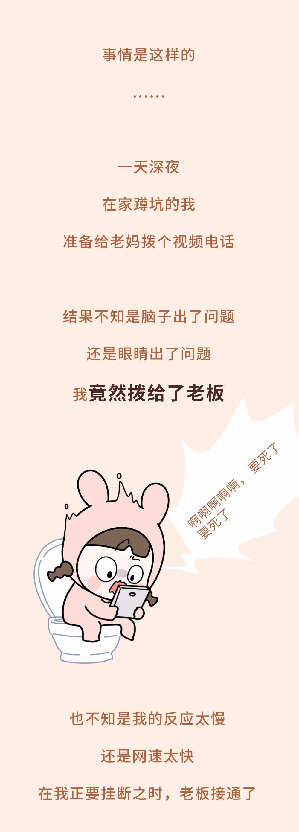 大家我是兔姐,此刻我非常尴尬,也非常后悔。原因有很多,听我给你长话短说。首先,一、我不小心拨通了老板电话这件事,现在全公司人都知道了;二、为了让大家觉得这件事情已经过去了,对我影响不大,于是我把它写在了故事的开头(其实聪明的我是有私心的,如果我把这件糗事都写出来了,那么老板就一定不会再为难我了吧,对不对?我这可是用生命在努力工作,对不对?这份工作吗,我肯定是保住了,对不对?);三、但是刚刚领导看我的眼神,还是透露出了一股“这个小女孩奇奇怪怪,不知道脑壳里面在想什么”的感觉……唉,算了,不说了,说了也是一把心酸泪。目前来说就是忐忑,非常忐忑。如果能够重来,我一定不会拨通那个电话,至少不会是在蹲马桶期间,我真的太惨了!!!不过话说回来,我相信发错短信,打错字这种事情,大家一定也干过不少,千万不要藏着掖着,趁着这个机会,大家一起在评论区讲出自己的故事吧,兔姐会选出自认为最尴尬的那位,然后利索果断地将尴尬之王的荣誉让给ta!!