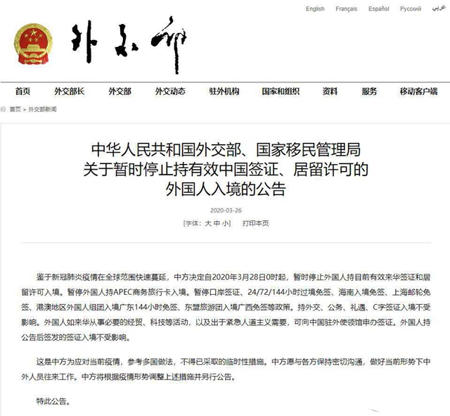 青岛新闻网3月27日讯(记者:孙忠晓)昨晚,中华人民共和国外交部在官网发布公告表示:鉴于新冠肺炎疫情在全球范围快速蔓延,中方决定自2020年3月28日0时起,暂时停止外国人持目前有效来华签证和居留许可入境。对于中国足坛而言,这意味着有相当多的一批外援、外教无法按期归来,中超联赛的开幕恐将无限期推迟。