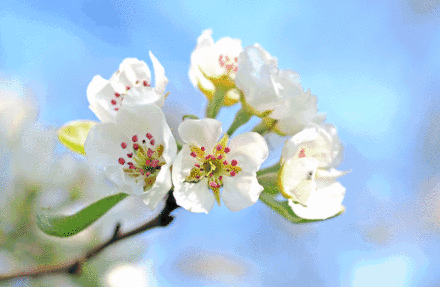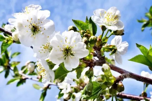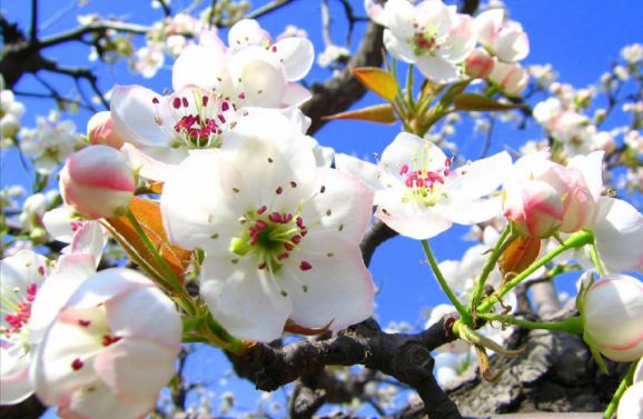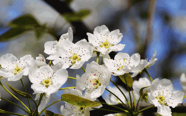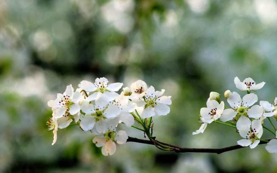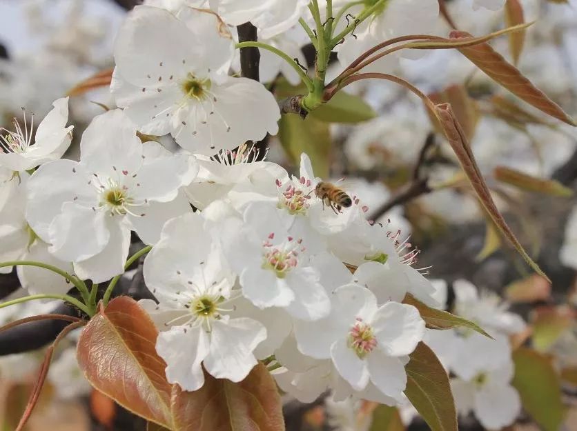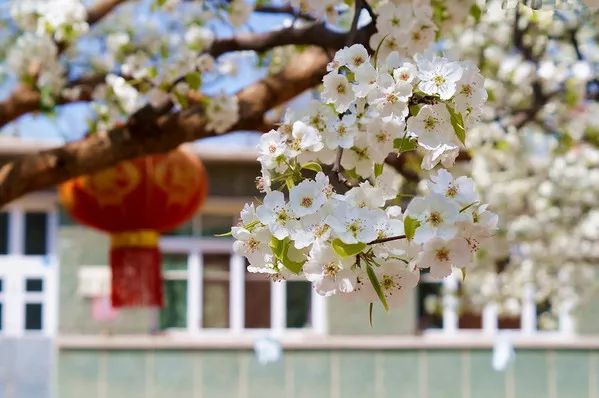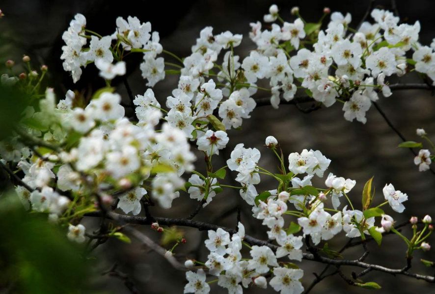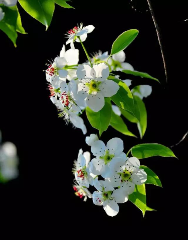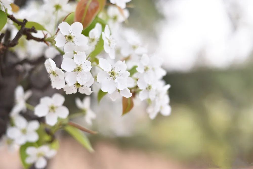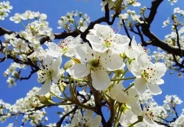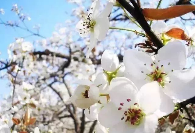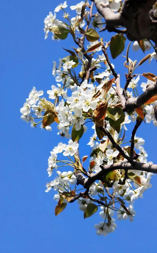 每一朵梨花都有自己的姿态。有的仰头拥抱美丽的春天;有的低头像个害羞的小姑娘;还有的半开半合,仿佛翘着兰花指在炫耀自己的美丽。