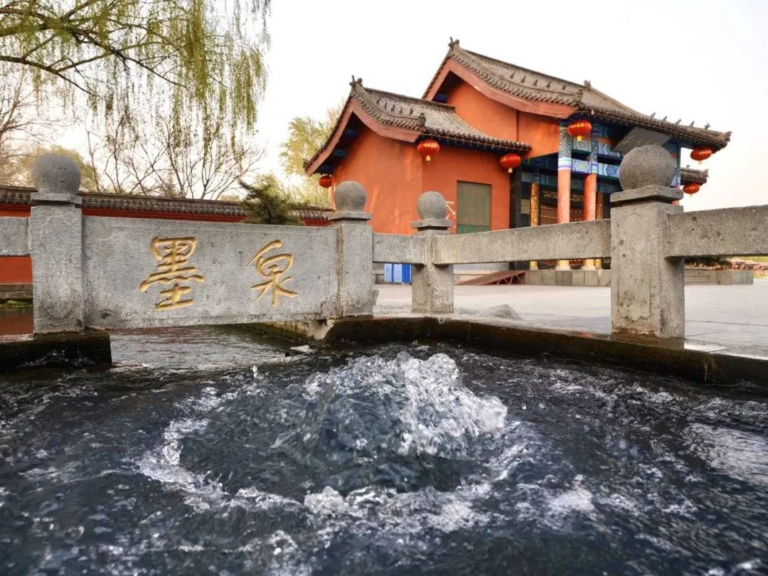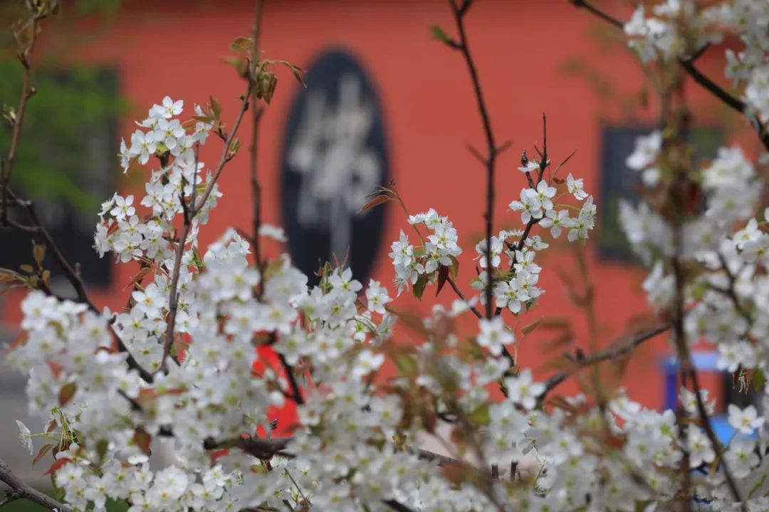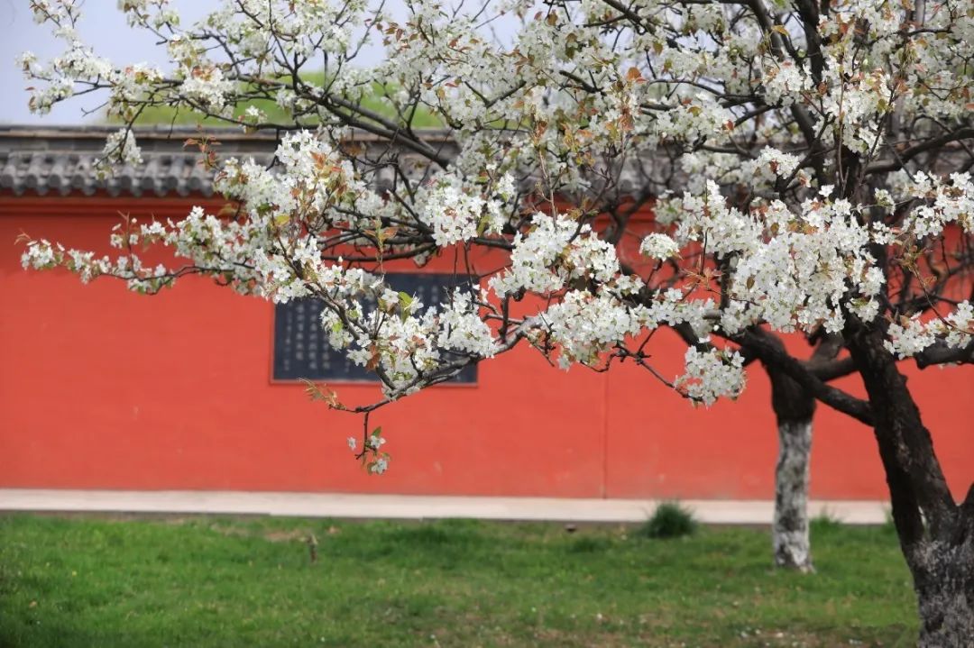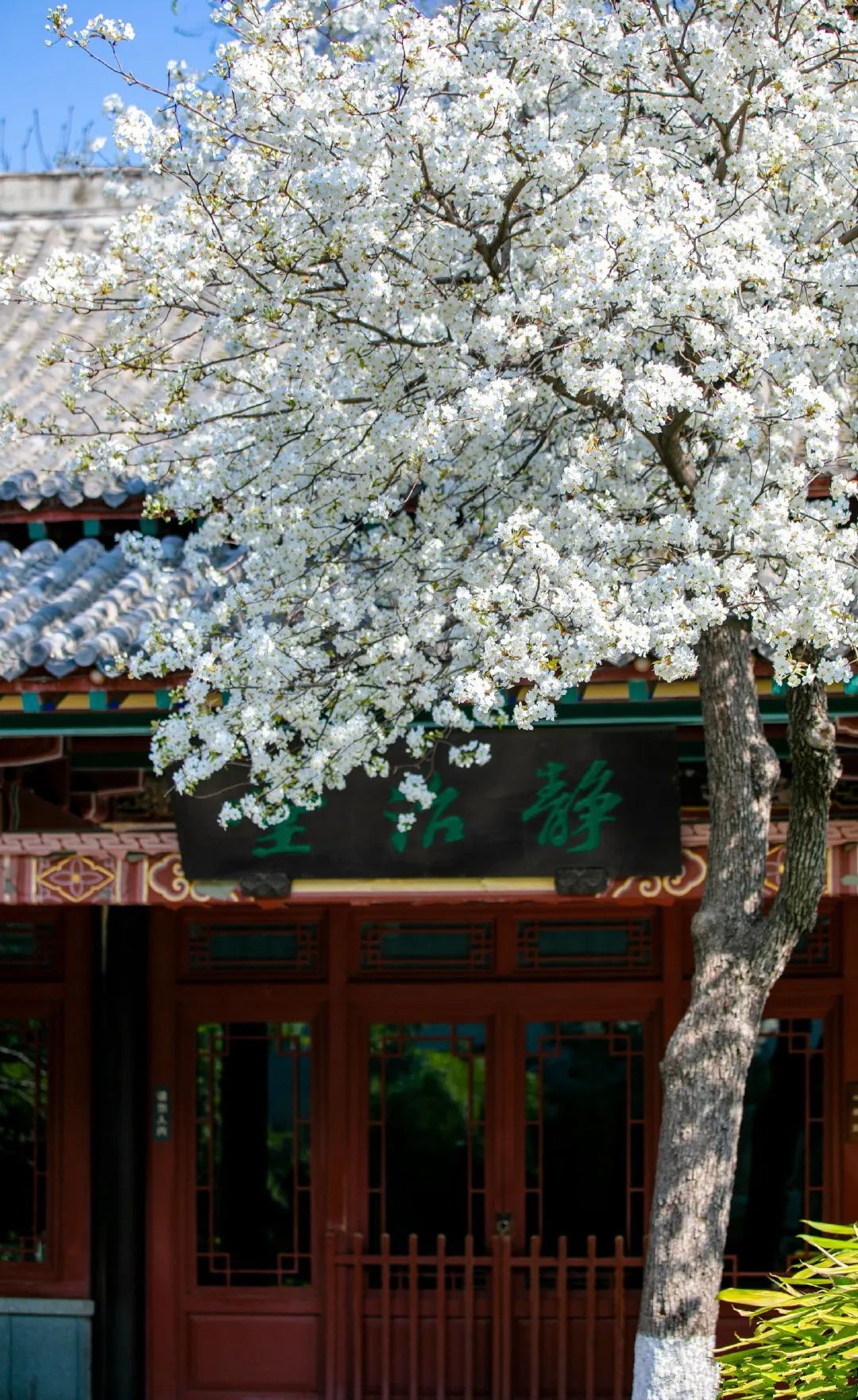 静默的梨花与墙外墨泉的喷涌一静一动,却显得格外的相得益彰。洁白的梨花也给沉寂的龙泉寺增添了一份生机。