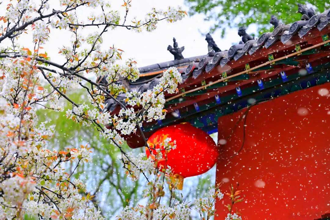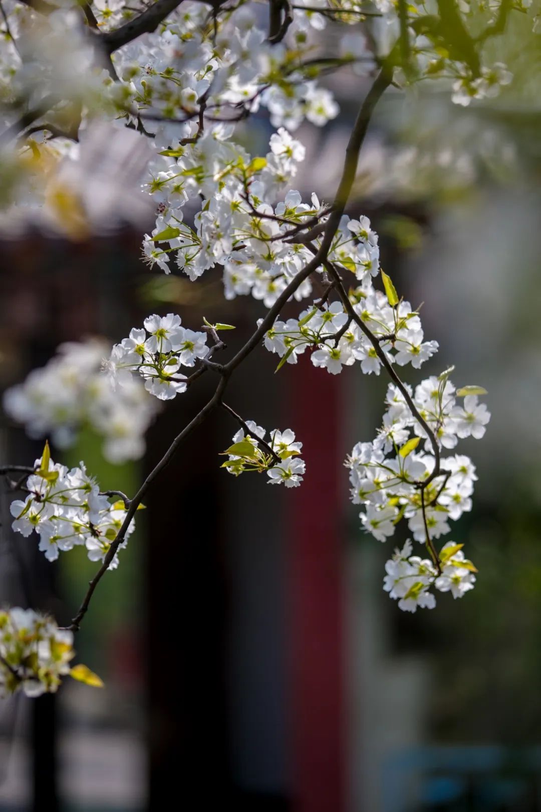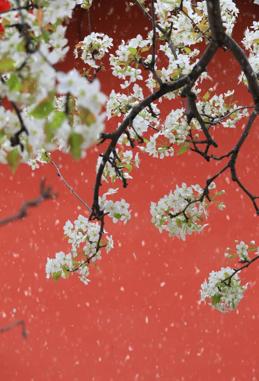 洁白的梨花在朱砂色院墙的衬托下,显得格外动人,微风一起,如雪的花瓣飞上斗拱屋檐,飞进回纹窗棂,最后落入泥土之中。