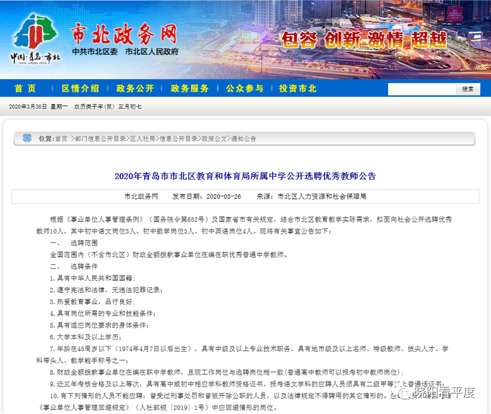 日前,2020年青岛市市北区教育和体育局所属中学公开选聘优秀教师公告发布,面向社会公开选聘优秀教师10人,其中初中语文岗位3人、初中数学岗位3人、初中英语岗位4人,4月19日报名截止。