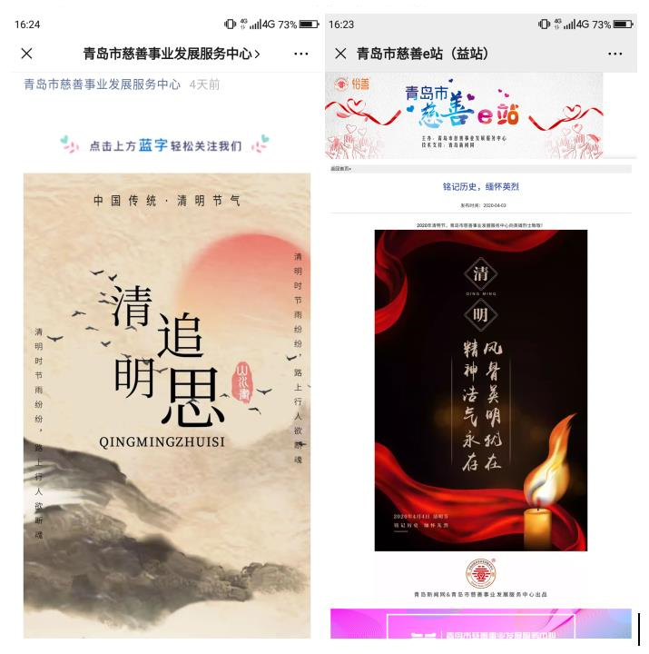 中心通过“青岛市慈善事业发展服务中心”官方微信公众号和“青岛市慈善e站”发布了“清明追思”和“铭记历史,缅怀英烈”主题图片,组织党员干部在青岛文明网“清明网上祭英烈”“传承英烈精神、争做时代新人”专题页面认真学习郭隆真、解文青、邓恩铭等革命英烈的崇高事迹,向英烈们献上鲜花、寄语留言,表达对他(她)们的沉痛悼念和崇高敬意,大家深切感受到今天美好生活的来之不易,进一步坚定了守好初心担使命、立足岗位做慈善的崇高信念。