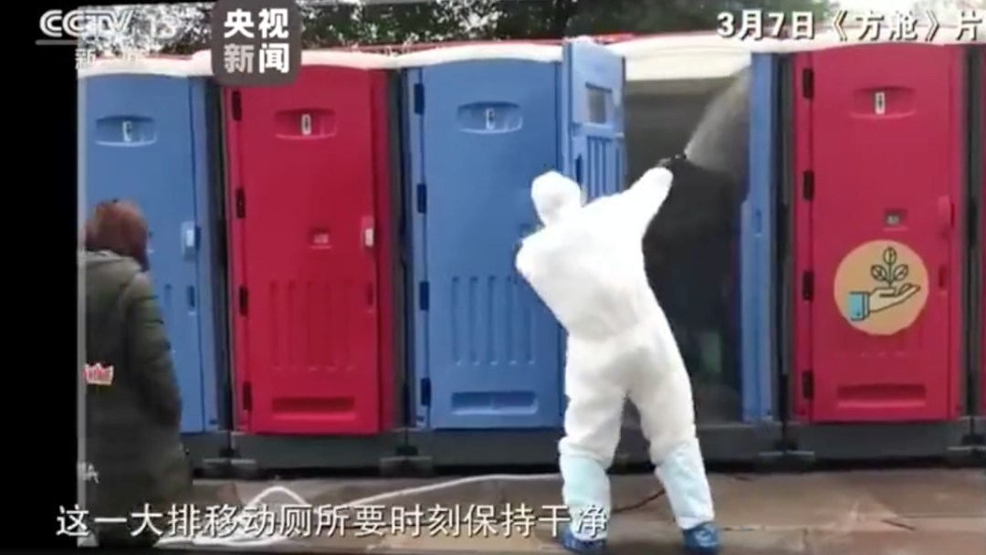 特殊时期,这一大排移动厕所更要时刻保持干净,不断消毒。
