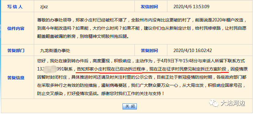 据透露:我处在接到转办件后,高度重视,积极响应,主动作为,于4月9日下午与来话人联系,告知郑家小庄村现在已启动拆迁程序,现在正在征求村民意见制定拆迁方案阶段,因疫情原因暂时封闭村庄,具体推进时间还请及时关注村里的公示公告,目前正处于新冠疫情防控时期,各级政府部门都在采取多种行之有效的防控措施,遏制病毒蔓延,我们广大群众要万众一心,从大局出发,积极响应国家号召,防止交叉感染,打好疫情攻坚战。