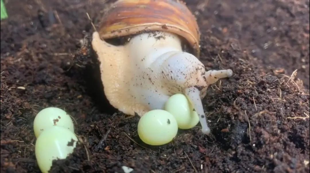 正在产蛋的蜗牛。据说蜗牛每年产6-7次蛋,每次产200只左右。真的看不出来这小小的蜗牛身体里,怎么藏的下那么多!