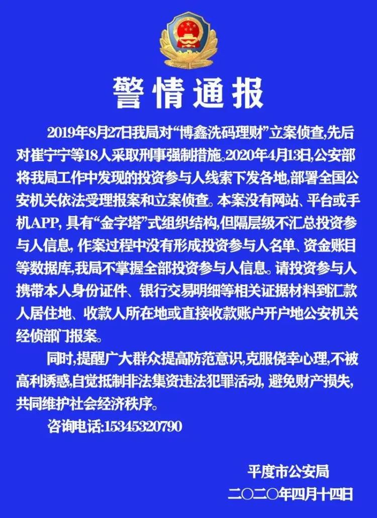 4月14日,记者从平度警方获悉,2019年8月27日平度市公安局对“博鑫洗码理财”立案侦查,先后对崔宁宁等18人采取刑事强制措施。