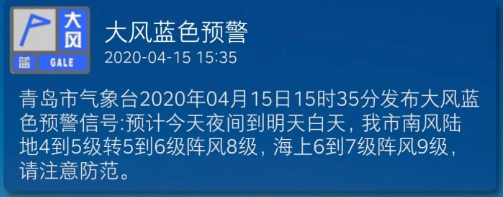青岛市气象台于今天下午15时35分发布大风蓝色预警信号,预计今天夜间到明天白天我市南风就会明显增大,呼呼的南风相对稳定,大概会持续到明天中午前后。