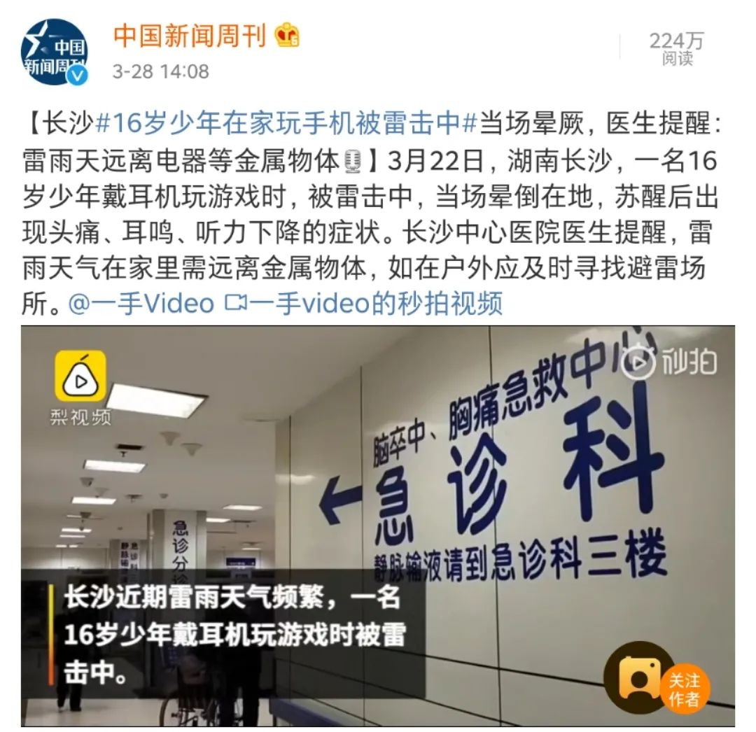 “噼里啪啦轰隆隆”的天气里,很容易出现因为防护不当造成的雷击事故,比如#少年玩手机被雷击中#等,严重时甚至有生命危险。