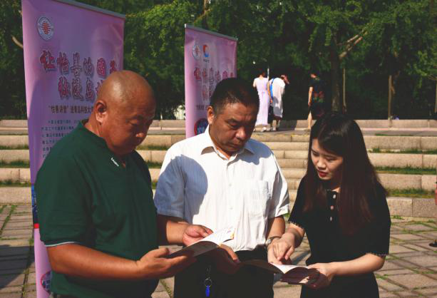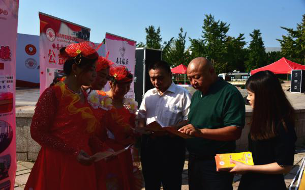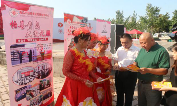 青岛市慈善事业发展服务中心工作人员向市民发放《慈善法》宣传折页并为他们答疑释惑