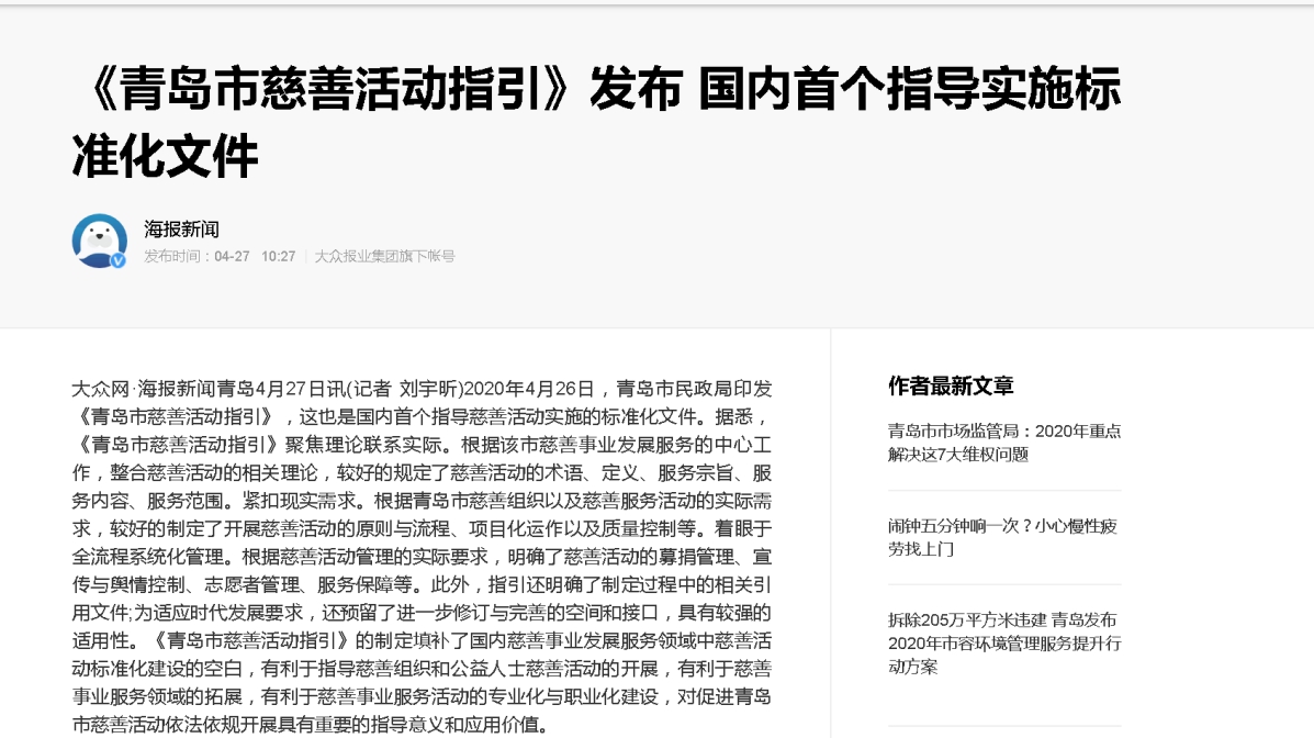 青岛海外网(今日头条):青岛发布国内首个指导慈善活动实施标准化文件