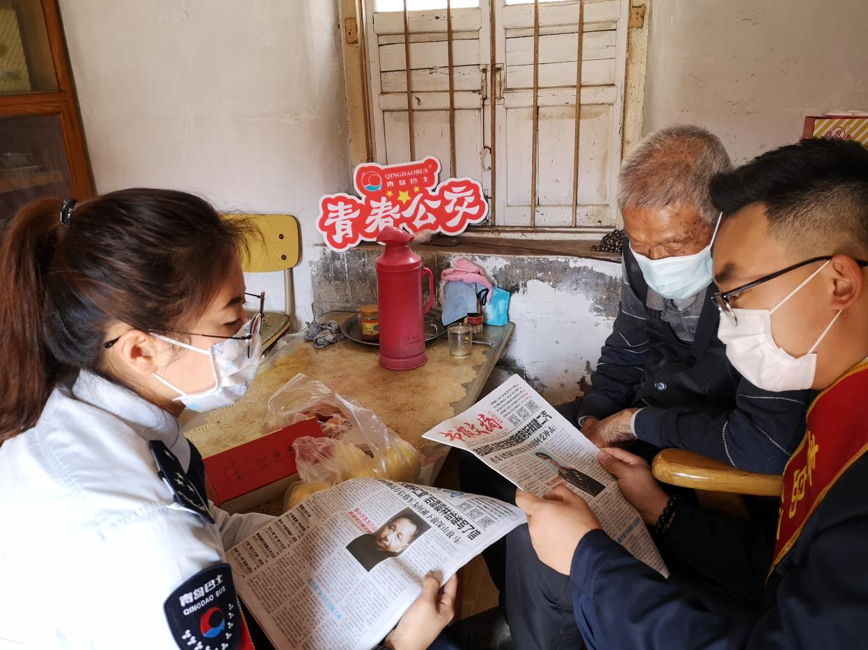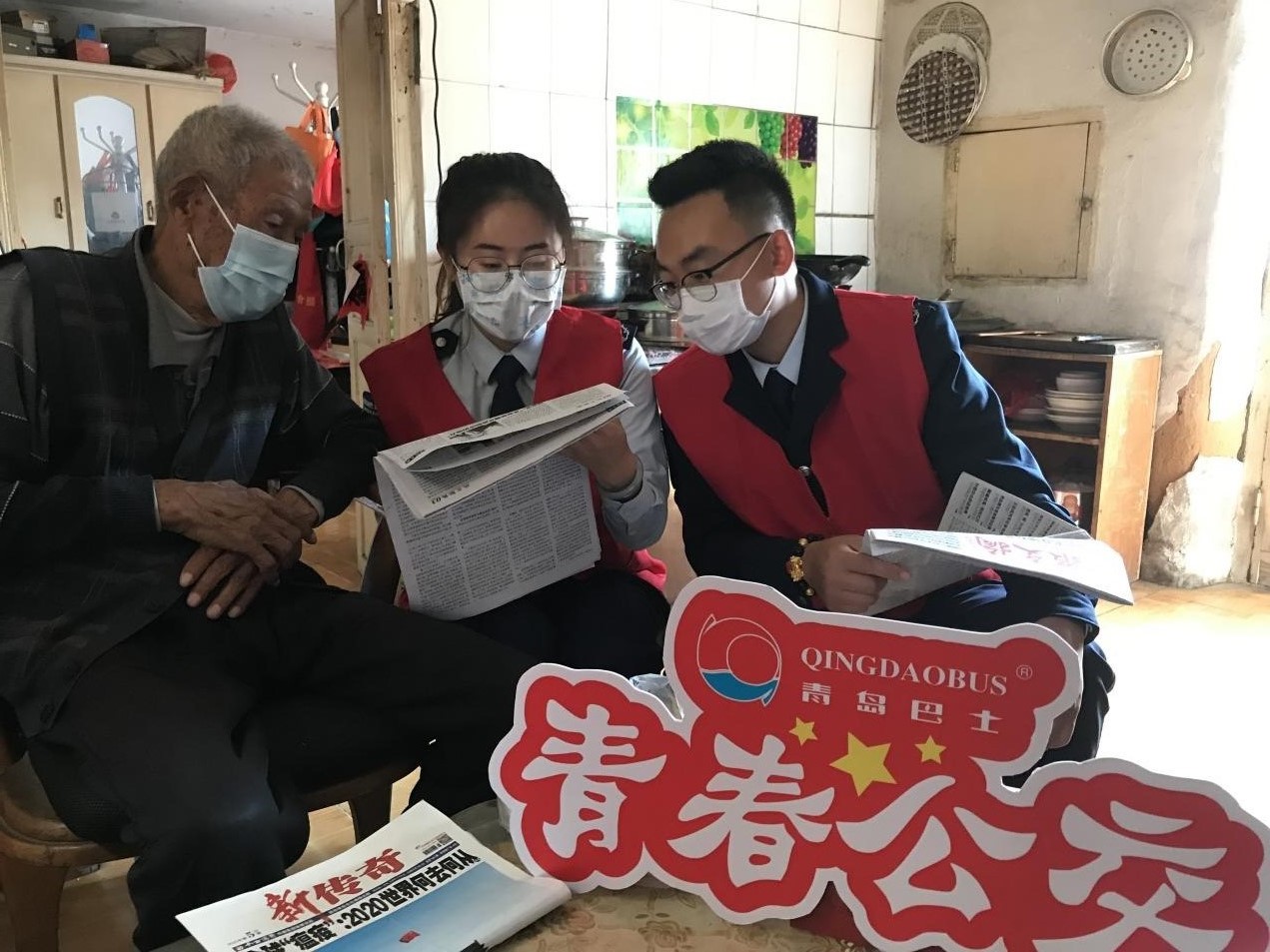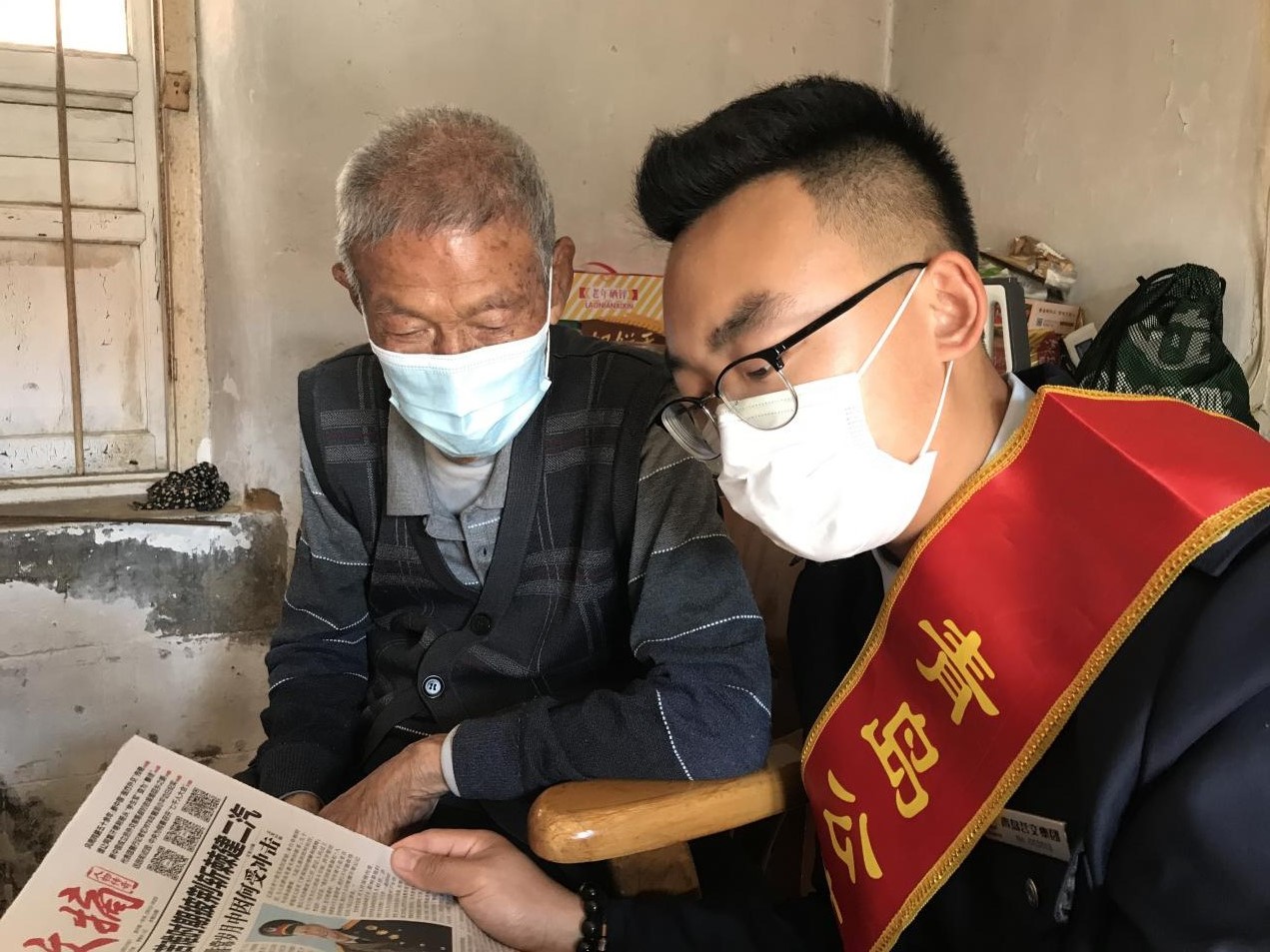 90岁的曲方平大爷家,看到志愿者到来的刹那间,老人脸上浮现出惊喜的表情,志愿者为曲大爷带来了他爱看的杂志和报刊,共青团志愿者张恒瑞和孙伟杰为曲大爷诵读了报纸上的精彩文章,曲大爷说听志愿者读报,今天就不用费眼神看了。团员志愿者说:只要爷爷爱听,以后我们会常来陪伴您为您读书读报的。曲大爷听了高兴的拍手叫好。志愿者询问了曲大爷最近的身体情况,讲述了最近外面的一些新鲜事与老人一起分享。