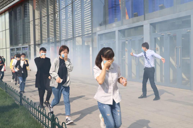 情景预设:当发生火灾时,迅速组织员工有序撤离、疏散。现场,“浓烟滚滚”,工作人员正齐心协力指挥员工紧急逃生。