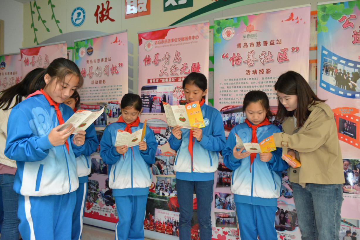 青岛市慈善事业发展服务中心工作人员向小学生发放《慈善法》宣传折页