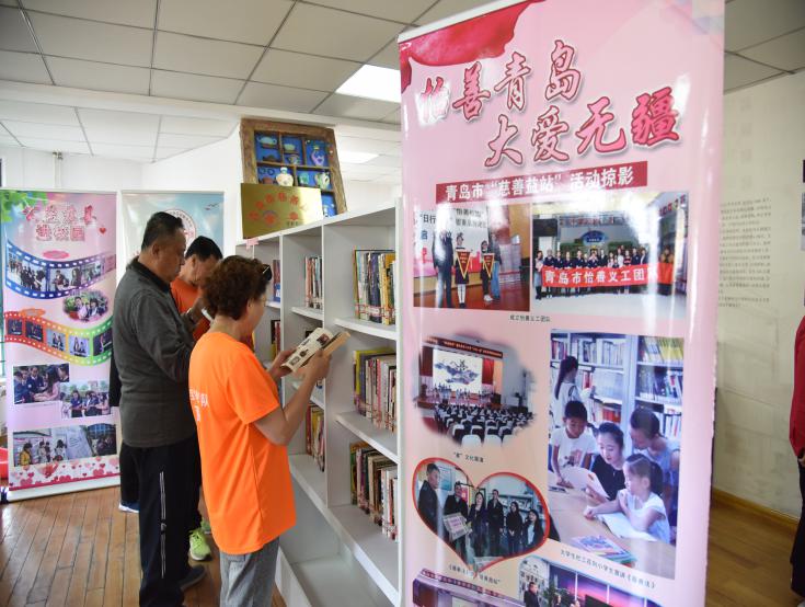 社区居民在青岛市慈善益站“怡善悦读”专区阅读《慈善法》相关书籍