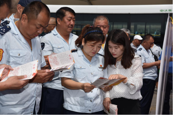 青岛市慈善事业发展服务中心工作人员向崂山巴士职工发放《慈善法》宣传折页