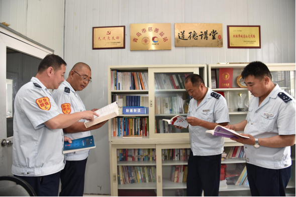青岛市慈善益站“怡善巴士”——青岛公交崂山巴士第六分公司职工在青岛市慈善益站“怡善悦读”专区阅读《慈善法》相关书籍