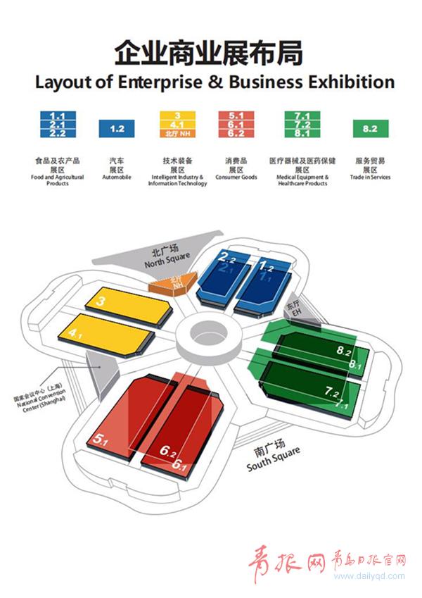 第三届进博会企业商业展规划面积36万平方米,共设服务贸易、汽车、技术装备、消费品、医疗器械及医药保健、食品及农产品六大展区。根据16日公布的展区图,食品及农产品展区分布在1.1、2.1和2.2号馆,汽车展区在1.2号馆,技术装备展区在3号馆、4.1号馆以及北厅,消费品展区在5.1、6.1和6.2号馆,医疗器械及医药保健展区在7.1、7.2及8.1号馆,服务贸易展区则在8.2号馆。
