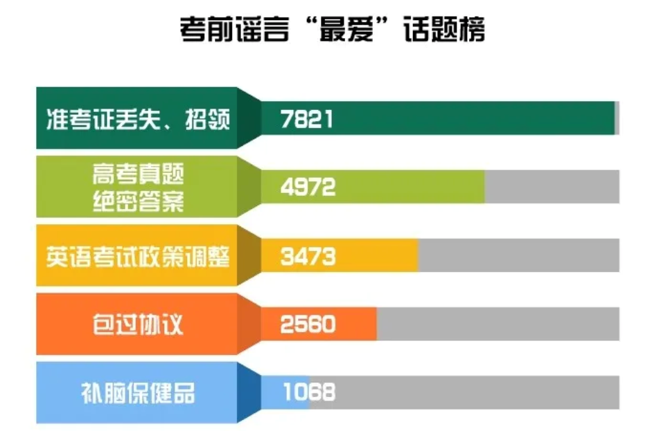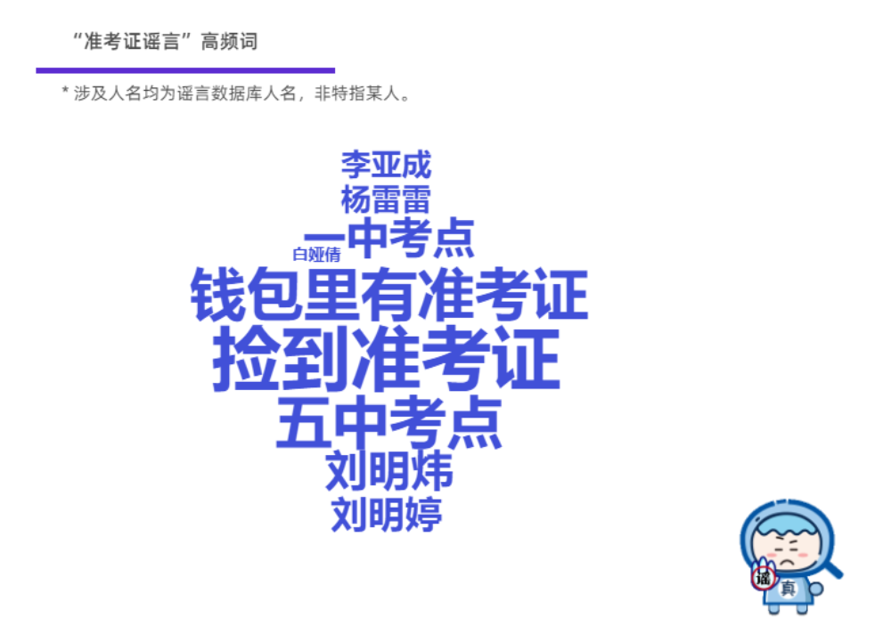 丢准考证事件每年都有发生,一方面让信息真假难辨,迷惑性强,不少网民正出于善于转发,给了谣言可乘之机;另一方面,其较高的出现频率、旧谣新传等特点,也为识谣辨谣提供了契机。中国互联网联合辟谣平台对近3年此类谣言进行梳理,归纳出此类谣言高频词,看到它们,就别转了!