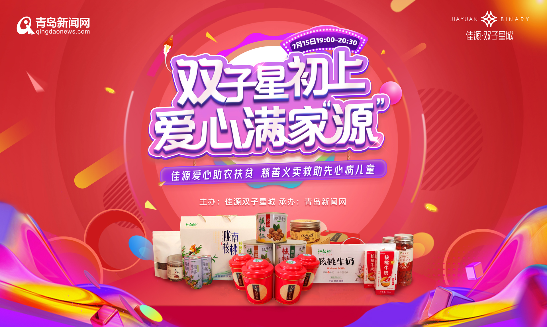 (记者 于灏源)7月15日晚间19:00-20:30,由佳源双子星城主办,青岛新闻网承办的“双子星初上爱心满家源”助农扶贫慈善义卖直播活动将在青岛新闻网和微信小程序上线。作为“网信助力”青岛网络直播带货季的重点活动之一,本次直播将带来陇南核桃乳、红枸杞、多种口味核桃仁、大红袍花椒等甘肃陇南助农优质特产。