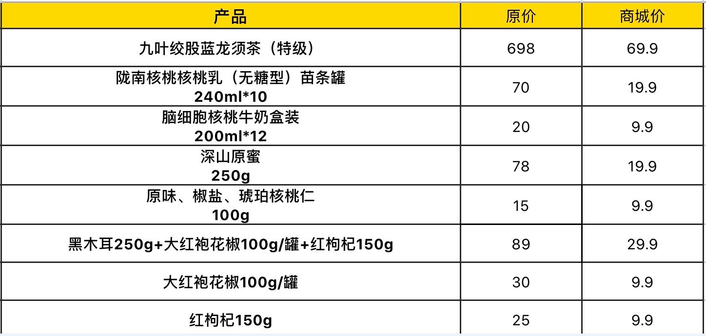原价698元的九叶绞股蓝龙须茶,青岛新闻网商城价只需69.9元;原价70元每箱的陇南核桃乳(无糖型),青岛新闻网商城价19.9元;原价20元的脑细胞核桃牛奶12盒装,青岛新闻网商城价9.9元;原价78元的深山原蜜(250g),青岛新闻网商城价19.9元;原价15元的原味、椒盐、琥珀核桃仁(100g),青岛新闻网商城价9.9元。