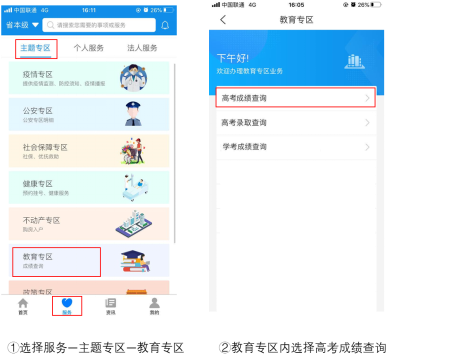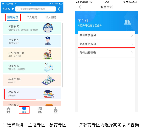 点击各级分厅“服务”选项,找到“主题专区”中的“教育专区”,高考各项应用均有提供。