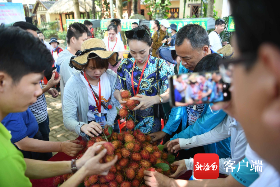 7月29日,2020全国抗疫英雄海南行暨海南自由贸易港全国重点网媒推介活动走进保亭布隆赛什进村,嘉宾品尝红毛丹。记者 沙晓峰 摄